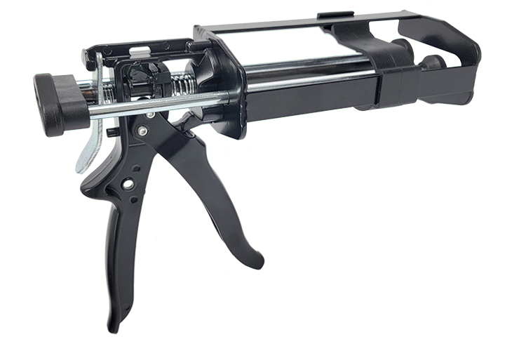 Universal applicator gun for use with 1:1 ratio 300 mL and 200 mL cartridges only. Built-in cartridge stabilizing plate for extra support. Extra durable, heat-treated piston rod. Precision sintered friction plate. Easy release star-burst reverse gripping plate. Zinc alloy handle. 26:1 Thrust Ratio.